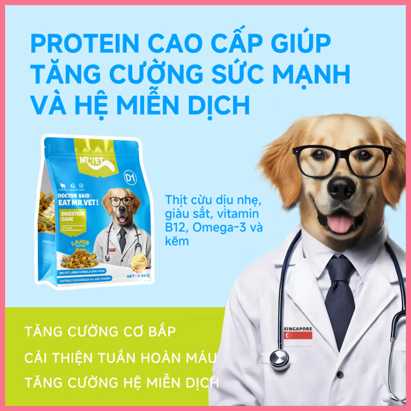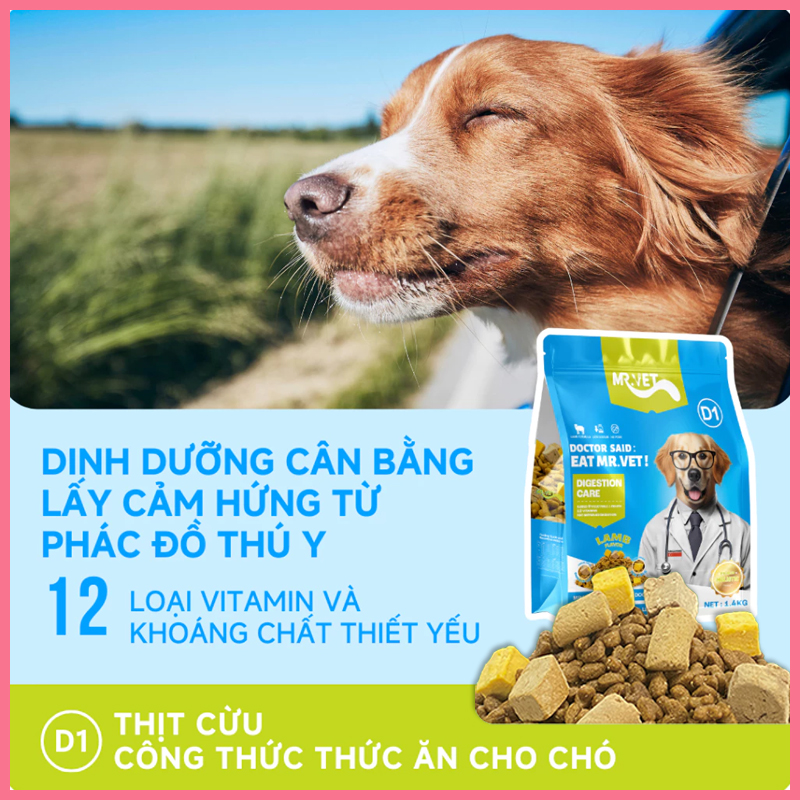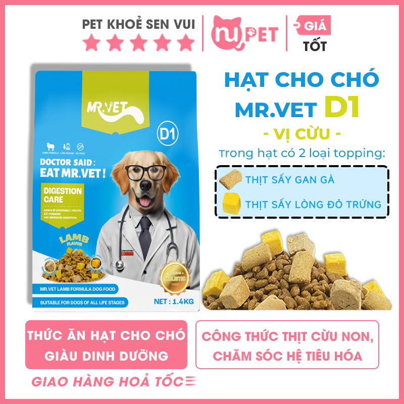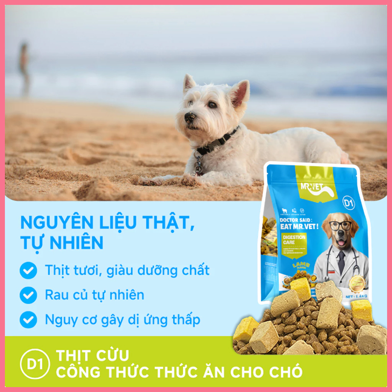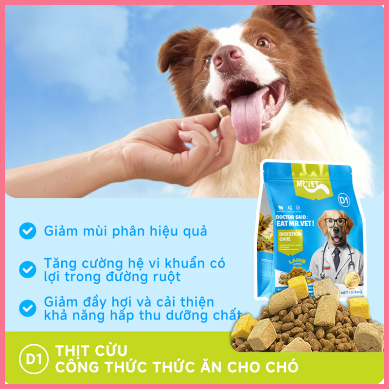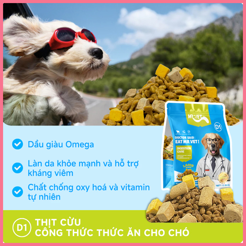 Nếu bạn đang tìm loại hạt vừa dinh dưỡng, vừa hỗ trợ sức khỏe đường tiêu hóa cho chó cưng thì MR.VET D1 là dòng thức ăn hạt đáng cân nhắc. Với công thức từ thịt cừu kết hợp cùng rau củ và vitamin giúp khẩu phần ăn hằng ngày của bé trở nên cân bằng hơn.