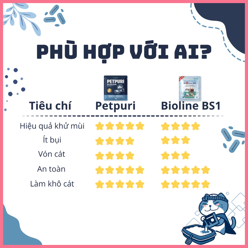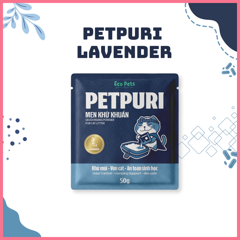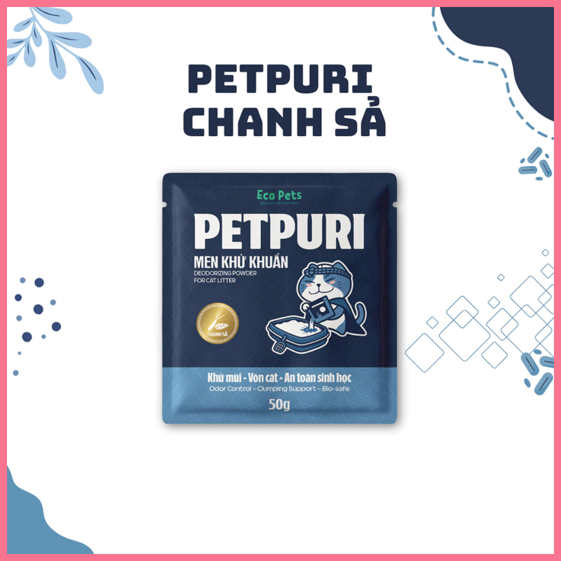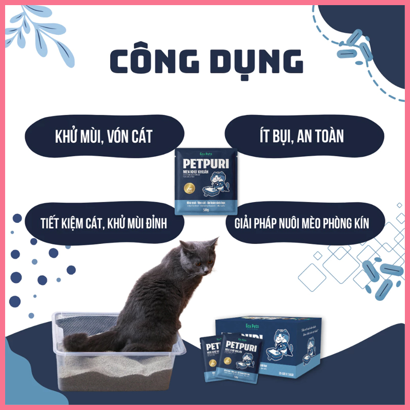 - Petpuri: Bacillus subtilis ≥1×10⁸ CFU/g + baking soda + zeolite → khử mùi + trung hòa amoniac + hút ẩm & vón cát + ít bụi.