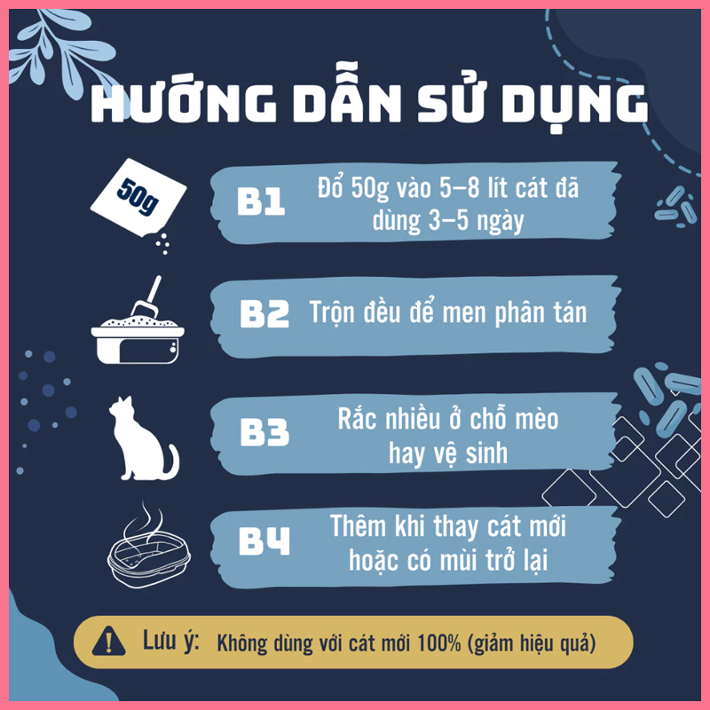 - Liều lượng: Sử dụng 1 gói men khử khuẩn Petpuri 50g cho 5–8 lít cát đã sử dụng 3–5 ngày.