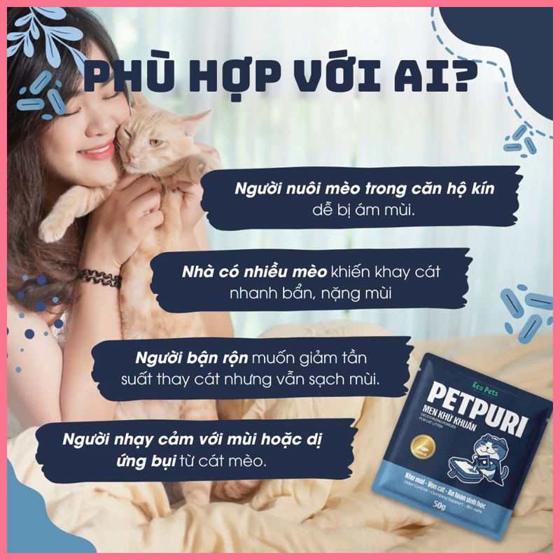 Sen ơi, đằng sau mùi hôi khó chịu của khay cát chính là hàng triệu vi khuẩn đang sinh sôi. Đã đến lúc nâng cấp tiêu chuẩn sạch sẽ với men khử khuẩn Petpuri – Giải pháp sinh học giúp bạn duy trì một môi trường sống trong lành, sạch khuẩn cho cả gia đình và Boss. Khác với các loại men khử mùi thông thường, Petpuri kết hợp 3 tác động: vi sinh – hóa học – vật lý, giúp khử mùi triệt để, giữ khay khô thoáng và mang lại trải nghiệm dễ chịu hơn cho cả mèo lẫn Sen.