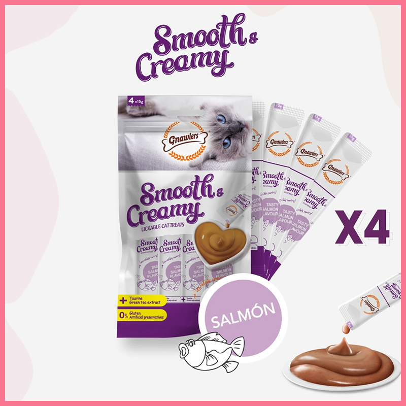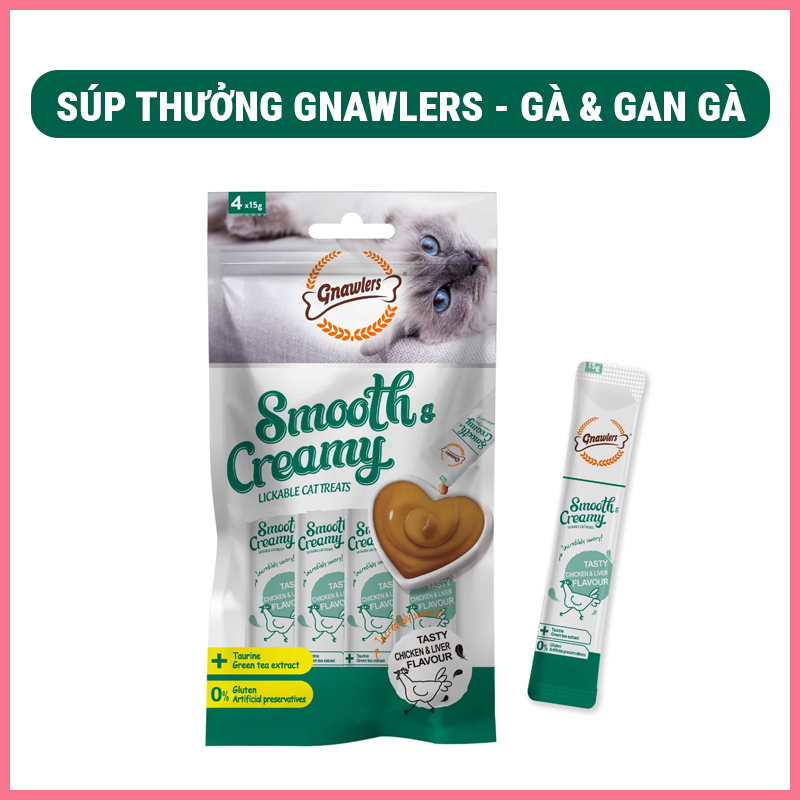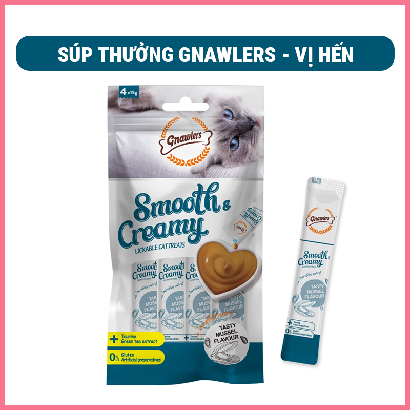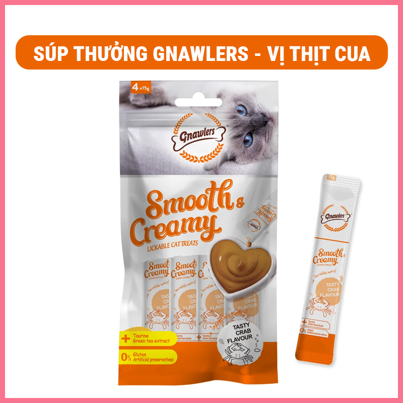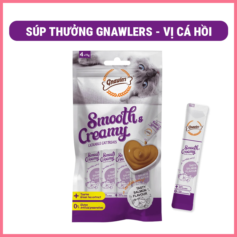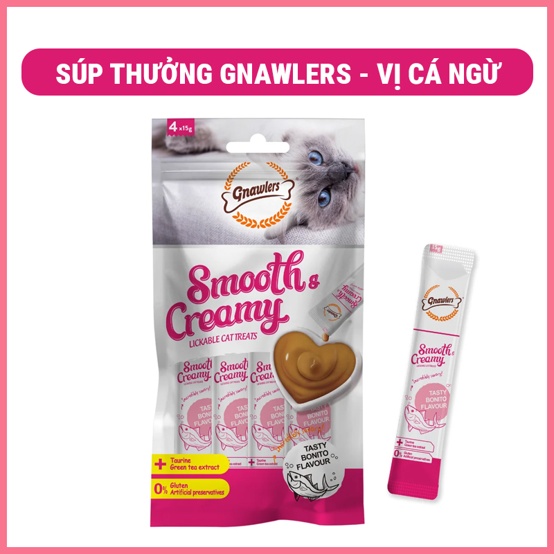 Mèo biếng ăn, lười uống nước hay kén ăn là nỗi lo quen thuộc của rất nhiều sen. Súp thưởng mèo Gnawlers Smooth & Creamy ra đời như một giải pháp cho các sen vì vừa là món súp thưởng thơm ngon, vừa hỗ trợ bổ sung dưỡng chất và độ ẩm cần thiết cho cơ thể mèo. Kết cấu sánh mịn như kem, dễ liếm cùng hương vị từ các loại cá và gà giúp mèo hào hứng hơn trong mỗi bữa ăn phụ.
