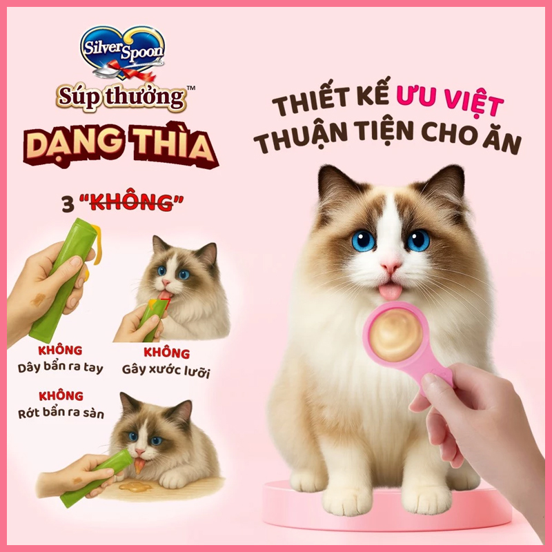 Bạn thường gặp cảnh “đau đầu” mỗi lần cho mèo ăn súp: Bóp hoài súp mới trồi lên, dây ra tay, nhỏ xuống sàn, mèo thì ăn lem nhem còn bạn thì cực. Những rắc rối nhỏ này lặp lại mỗi ngày khiến việc cho ăn trở nên mệt mỏi hơn bình thường. Chính vì vậy, súp thưởng Silver Spoon dạng thìa ra đời như một cách gọn gàng hơn. Không cần bóp, không lo dây bẩn, chỉ việc mở gói và đưa thìa cho mèo ăn sạch sẽ, nhẹ nhàng.